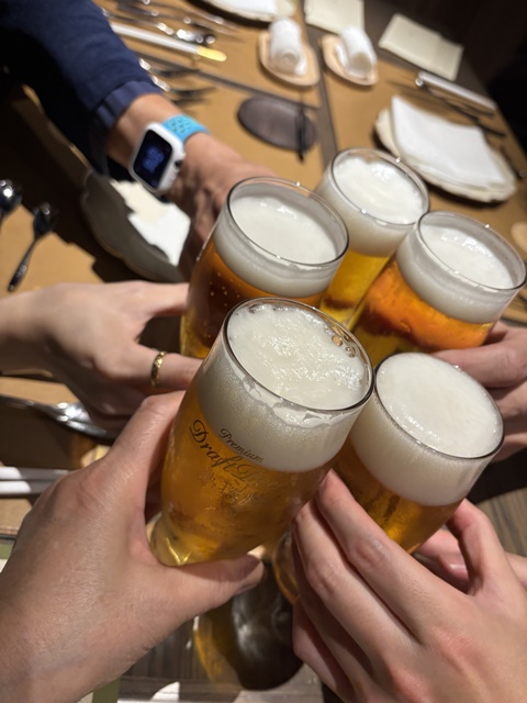 さて、夕食の時間です。まずは、早朝からのロケで疲れた体が欲しがっているビールで「お疲れ様!」の乾杯。