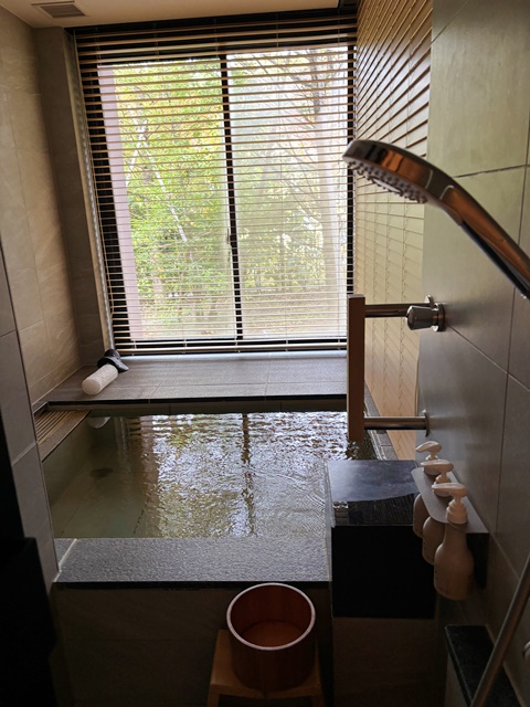 お風呂は温泉です。蓼科からの運び湯で、お風呂の奥には岩盤浴が出来るホットストーンが設えられています。